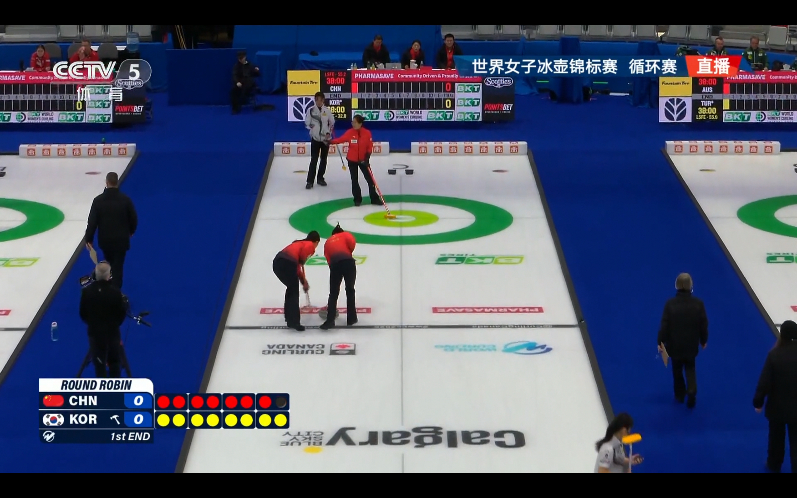 #头条创作训练营#CCTV-5 is currently broadcasting the Women's Curling World Championship match between China and Korea.