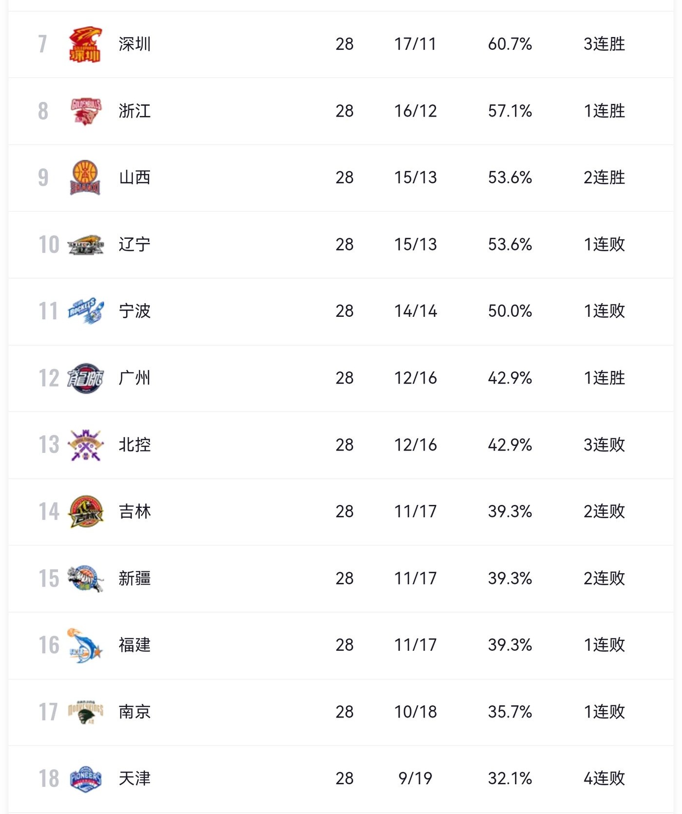 Tianjin Pioneers has 9 wins and 19 losses, ranking 18th in the league. They are currently suffering a three-game losing streak and are essentially out of playoff contention.