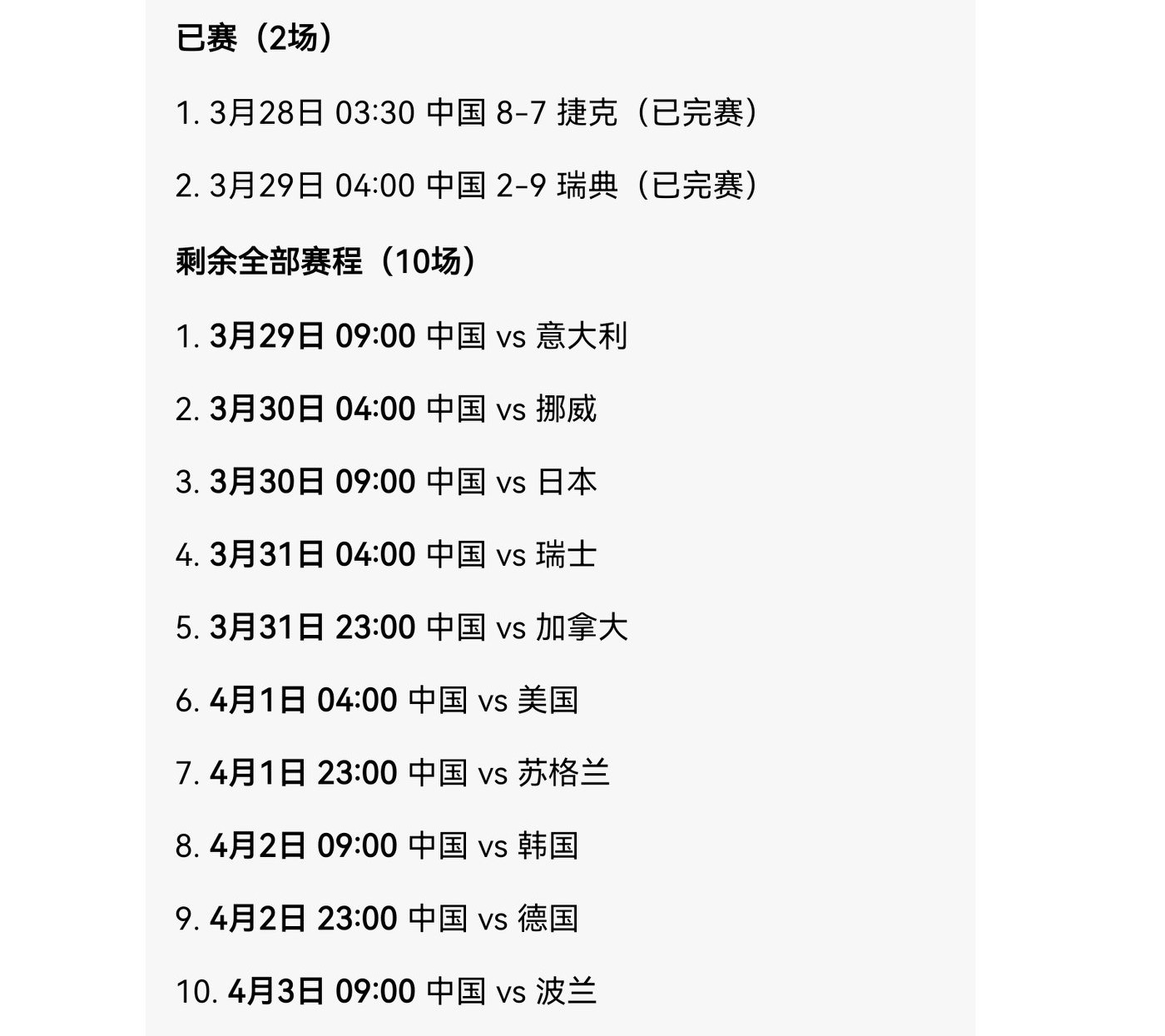 4. In the first match, China vs Italy. In the recently concluded Milan Winter Olympics, we defeated them decisively 11-4, so the probability of winning today is also quite high. Personal prediction: China wins again against Italy, 8-6 or 8-5.