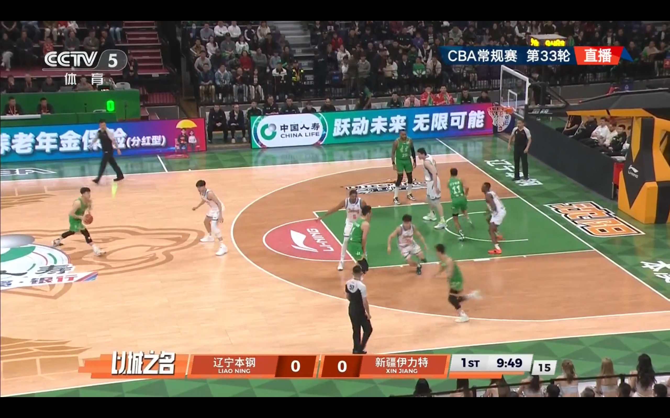 CCTV-5 is live broadcasting the CBA Regular Season Round 33 match between Liaoning Ben Gang and Xinjiang Yinteli.