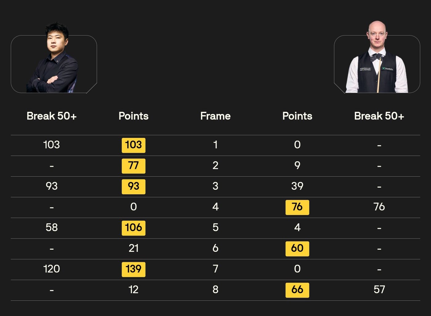 2. Detailed statistics for the first stage's eight frames are shown in the figure below. Zhao Xintong achieved two century breaks and two 50+ scores, while his opponent Wakelin only had two 50+ scores. This shows Zhao Xintong's attacking ability is far stronger than Wakelin's. We look forward to Zhao Xintong improving his defensive skills to achieve a balance of offense and defense, ultimately winning the championship and creating a miracle.